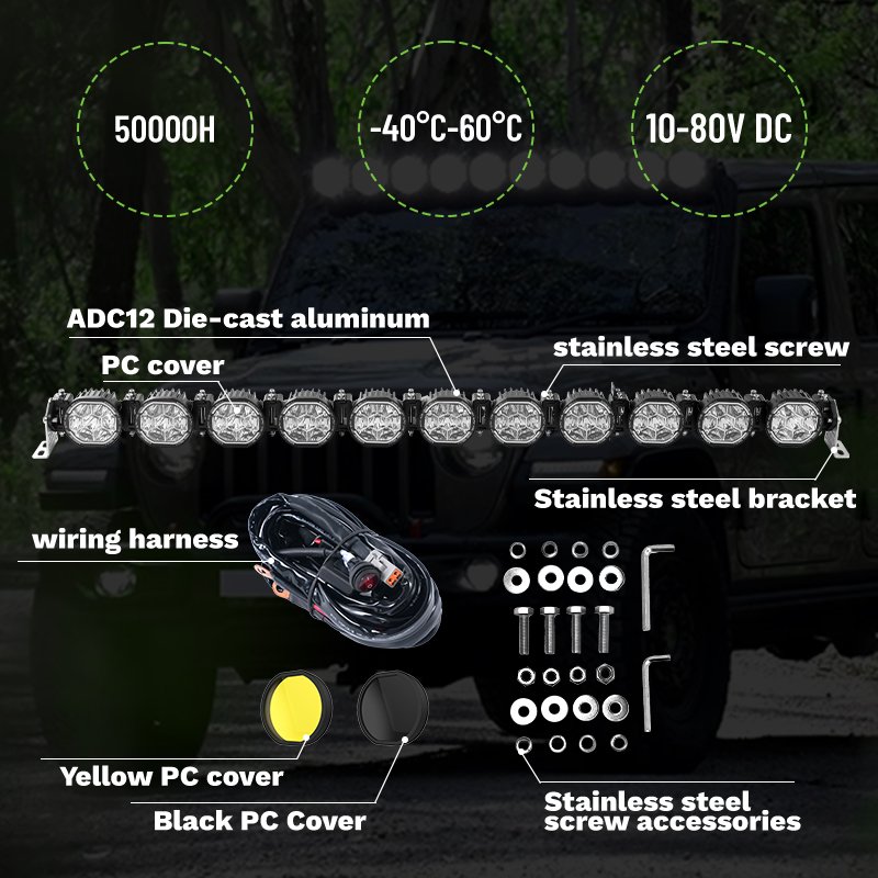 The brightest LED off-road lights: The LED off-road light bar can be composed of up to 12 independent light units, providing sufficient light for your off-road vehicle, and can provide clear lighting even in bad weather such as nightfall or fog and rain, ensuring that the driver has a clear and unobstructed view.